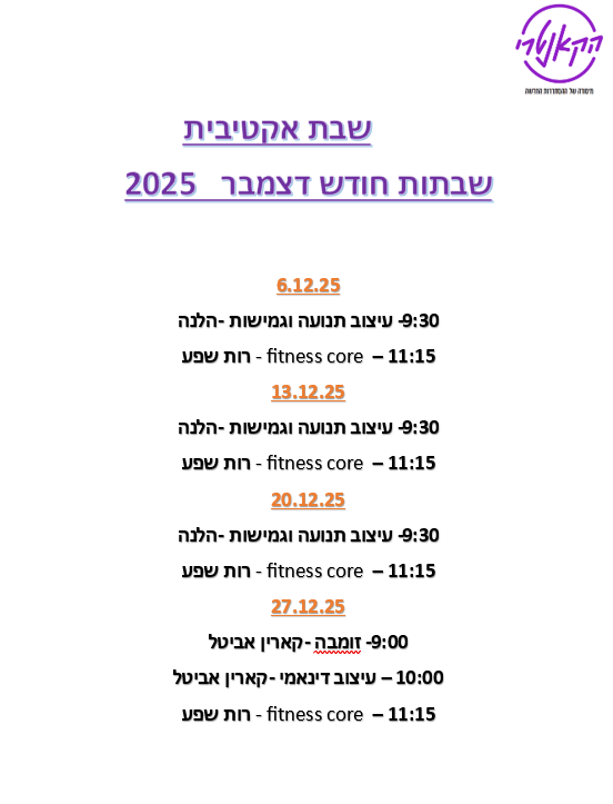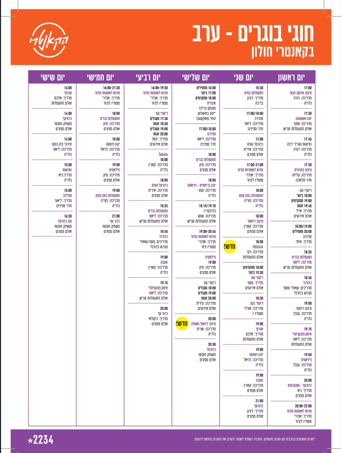 • לקוחות יקרים, לוח החוגים אינו מעודכן יש להתעדכן בלשונית "עדכונים" , המשך פעילות מהנה